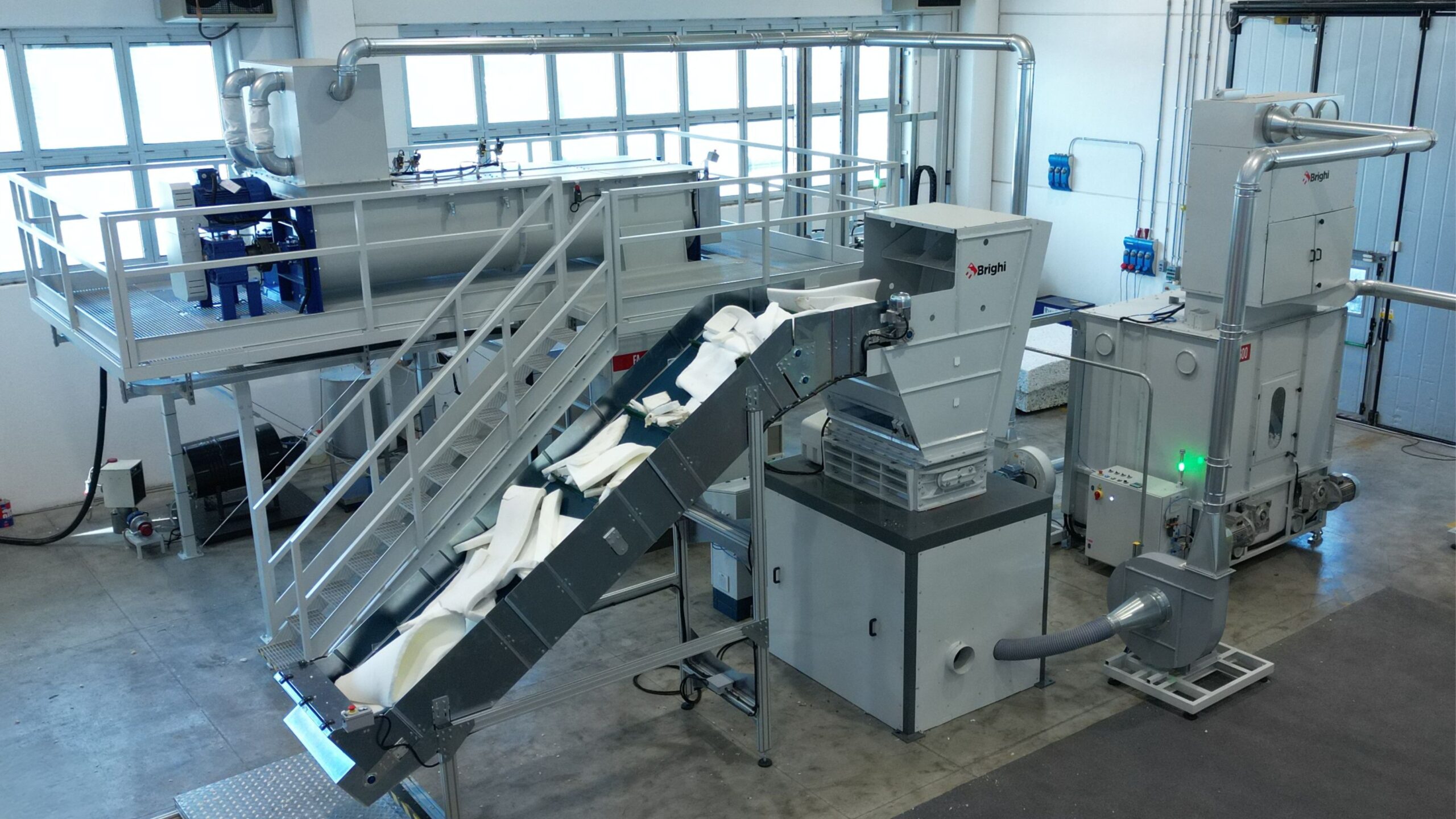 This rebonded block forming line is made of a shredder, a mixer and the rebonding machine. It uses polyethylene, polystyrene and polyurethane scraps of different types and densities to create homogeneous blocks of rebonded foam, a reusable material that can be used in several applications, among which bedding, insulation and automotive.